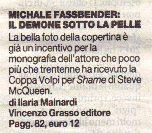 Testo della recensione: MICHALE FASSBENDER: IL DEMONE SOTTO LA PELLE. La bella foto della copertina è già un incentivo per la monografia dell' attore che poco più che trentenne ha ricevuto la Coppa Volpi per Shame di Steve McQueen. Di Ilaria Mainardi Vincenzo Grasso Editore Pagg. 82, euro 12.