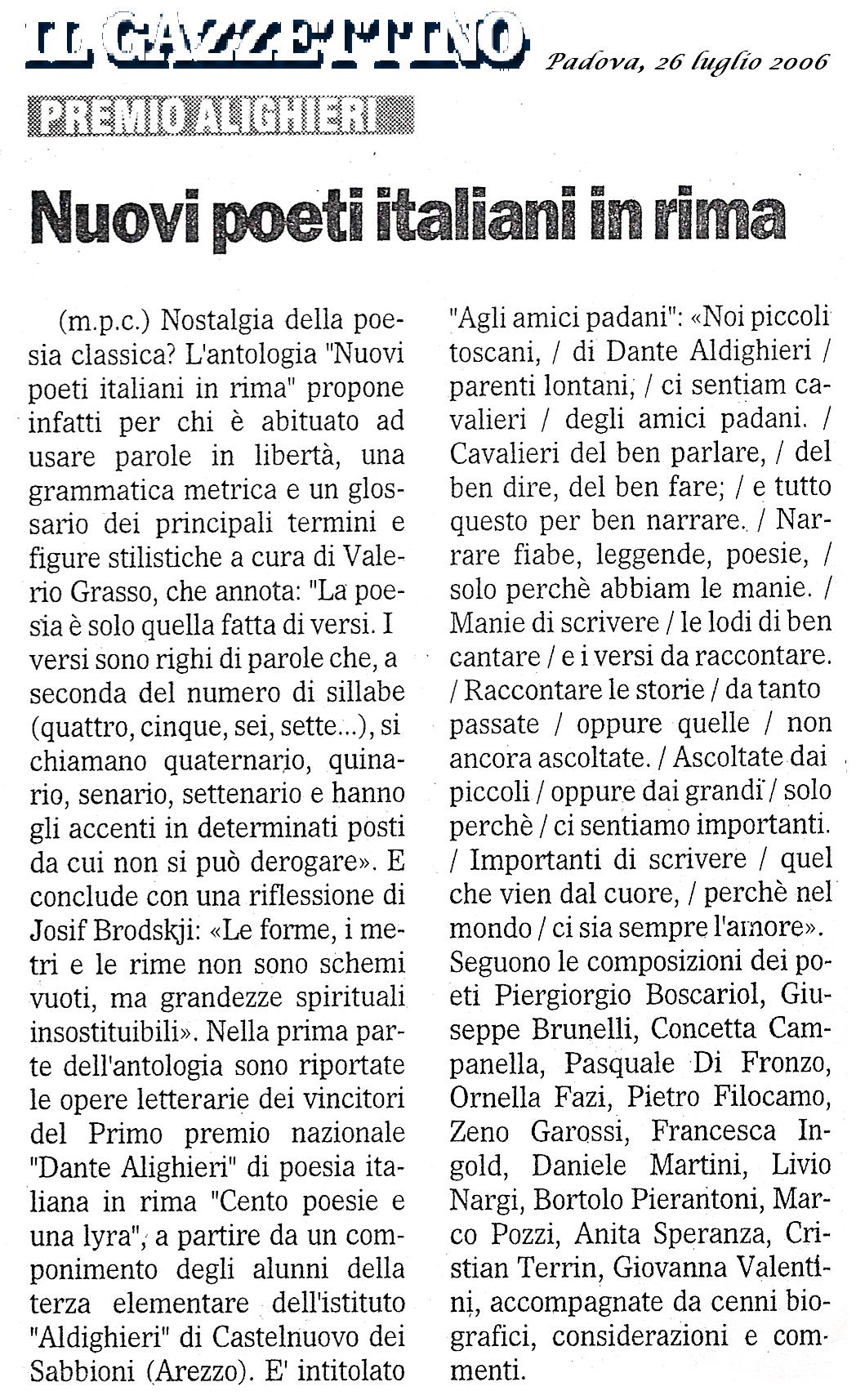 Testo della recensione: Nostalgia della poesia classica? L'antologia "Nuovi poeti italiani in rima" propone infatti per chi è abituato ad usare parole in libertà, una grammatica metrica e un glossario dei principali termini e figure stilistiche a cura di Valerio Grasso, che annota: "La poesia è solo quella fatta di versi. I versi sono righi di parole che, a seconda del numero di sillabe (quattro, cinque, sei, sette...), si chiamano quadernario, quinario, senario, settenario e hanno gli accenti in determinati posti da cui non si può derogare». E conclude con una riflessione di Josif Brodskji: «Le forme, i metri e le rime non sono schemi vuoti, ma grandezze spirituali insostituibili». Nella prima parte dell'antologia sono riportate le opere letterarie dei vincitori del Primo premio nazionale "Dante Alighieri" di poesia italiana in rima "Cento poesie e una lyra", a partire da un componimento degli alunni della terza elementare dell'istituto "Aldighieri" di Castelnuovo dei Sabbioni (Arezzo). È intitolato "Agli amici padani": «Noi piccoli toscani, / di Dante Aldighieri / parenti lontani, / ci sentiam cavalieri / degli amici padani. / Cavalieri del ben parlare, / del ben dire, del ben fare; / e tutto questo per ben narrare. / Narrare fiabe, leggende, poesie, / solo perchè abbiam le manie. / Manie di scrivere / le lodi di ben cantare / e i versi da raccontare. / Raccontare le storie / da tanto passate / oppure quelle / non ancora ascoltate. / Ascoltate dai piccoli / oppure dai grandi / solo perchè / ci sentiamo importanti. / Importanti di scrivere / quel che vien dal cuore, / perchè nel mondo / ci sia sempre l'amore». Seguono le composizioni dei poeti Piergiorgio Boscariol, Giuseppe Brunelli, Concetta Campanella, Pasquale Di Fronzo, Ornella Fazi, Pietro Filocamo, Zeno Garossi, Francesca Ingold, Daniele Martini, Livio Nargi, Bortolo Pierantoni, Marco Pozzi, Anita Speranza, Cristian Terrin, Giovanna Valentini, accompagnate da cenni biografici, considerazioni e commenti.