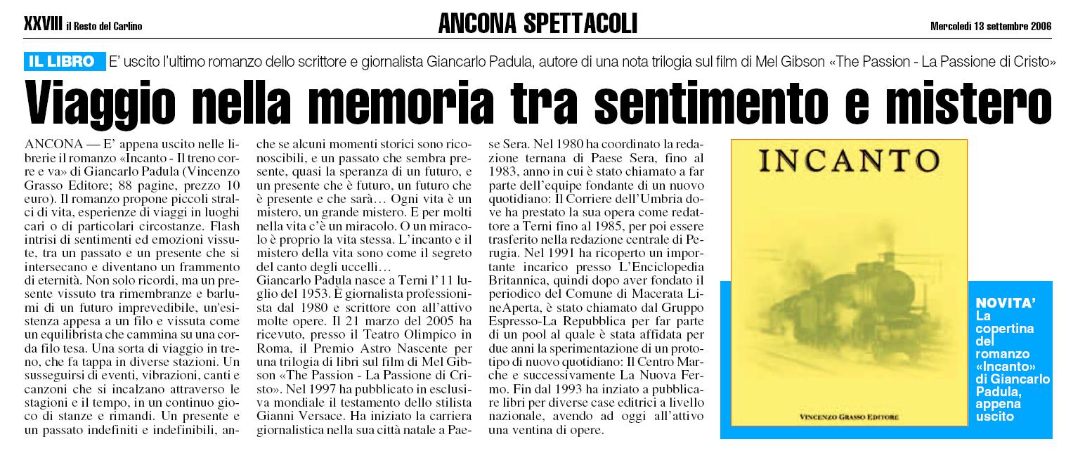 Testo della recensione: È appena uscito nelle librerie il romanzo «Incanto - Il treno corre e va» di Giancarlo Padula (Vincenzo Grasso Editore; 88 pagine, prezzo 10 euro). Il romanzo propone piccoli stralci di vita, esperienze di viaggi in luoghi cari o di particolari circostanze. Flash intrisi di sentimenti ed emozioni vissute, tra un passato e un presente che si intersecano e diventano un frammento di eternità. Non solo ricordi, ma un presente vissuto tra rimembranze e barlumi di un futuro imprevedibile, un'esistenza appesa a un filo e vissuta come un equilibrista che cammina su una corda filo tesa. Una sorta di viaggio in treno, che fa tappa in diverse stazioni. Un susseguirsi di eventi, vibrazioni, canti e canzoni che si incalzano attraverso le stagioni e il tempo, in un continuo gioco di stanze e rimandi. Un presente e un passato indefiniti e indefinibili, anche se alcuni momenti storici sono riconoscibili, e un passato che sembra presente, quasi la speranza di un futuro, e un presente che è futuro, un futuro che è presente e che sarà… Ogni vita è un mistero, un grande mistero. E per molti nella vita c’è un miracolo. O un miracolo è proprio la vita stessa. L’incanto e il mistero della vita sono come il segreto del canto degli uccelli… Giancarlo Padula nasce a Terni l’11 luglio del 1953. È giornalista professionista dal 1980 e scrittore con all’attivo molte opere. Il 21 marzo del 2005 ha ricevuto, presso il Teatro Olimpico in Roma, il Premio Astro Nascente per una trilogia di libri sul film di Mel Gibson «The Passion - La Passione di Cristo». Nel 1997 ha pubblicato in esclusiva mondiale il testamento dello stilista Gianni Versace. Ha iniziato la carriera giornalistica nella sua città natale a Paese Sera. Nel 1980 ha coordinato la redazione ternana di Paese Sera, fino al 1983, anno in cui è stato chiamato a far parte dell’equipe fondante di un nuovo quotidiano: Il Corriere dell’Umbria dove ha prestato la sua opera come redattore a Terni fino al 1985, per poi essere trasferito nella redazione centrale di Perugia. Nel 1991 ha ricoperto un importante incarico presso L’Enciclopedia Britannica, quindi dopo aver fondato il periodico del Comune di Macerata LineAperta, è stato chiamato dal Gruppo Espresso-La Repubblica per far parte di un pool al quale è stata affidata per due anni la sperimentazione di un prototipo di nuovo quotidiano: Il Centro Marche e successivamente La Nuova Fermo. Fin dal 1993 ha iniziato a pubblicare libri per diverse case editrici a livello nazionale, avendo ad oggi all’attivo una ventina di opere.